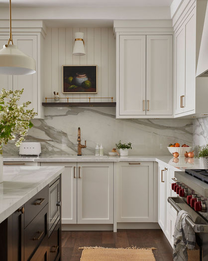 The renovation then extended to the main floor, where the kitchen, family room, and dining area—an open-concept space—were reimagined for modern living. A refined palette and thoughtful details create a timeless ambiance, while bold wallpaper in the powder room and foyer niche add unexpected character.